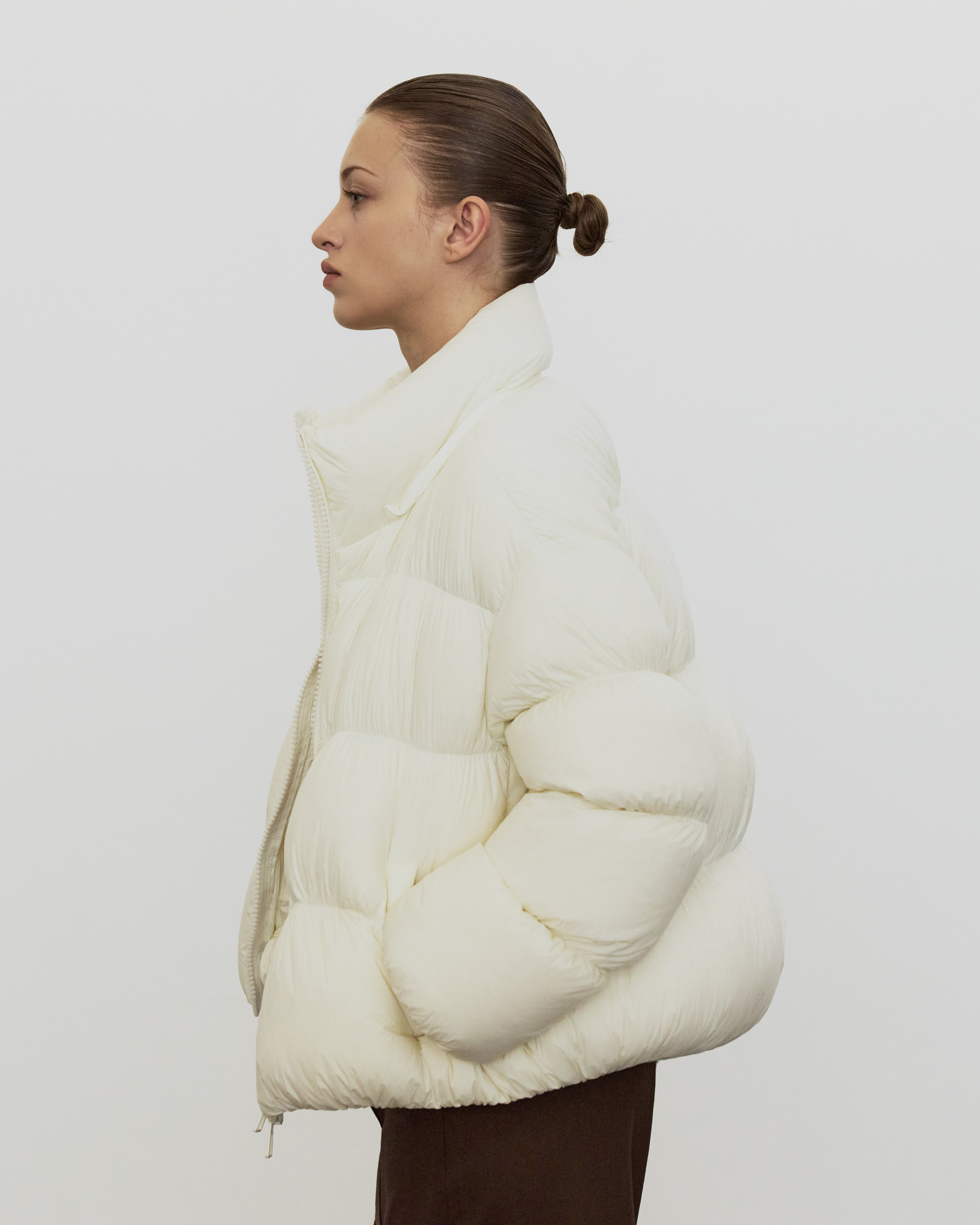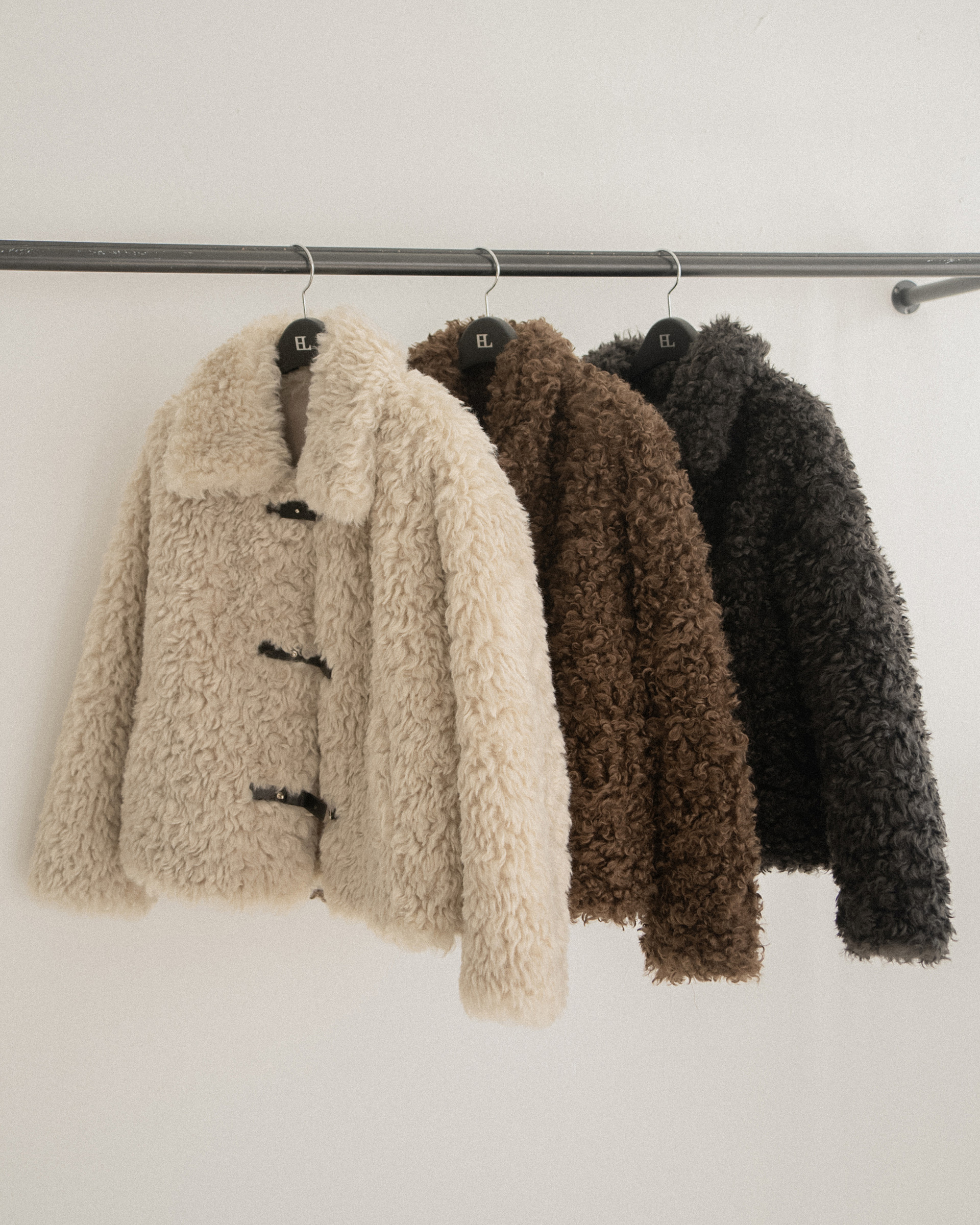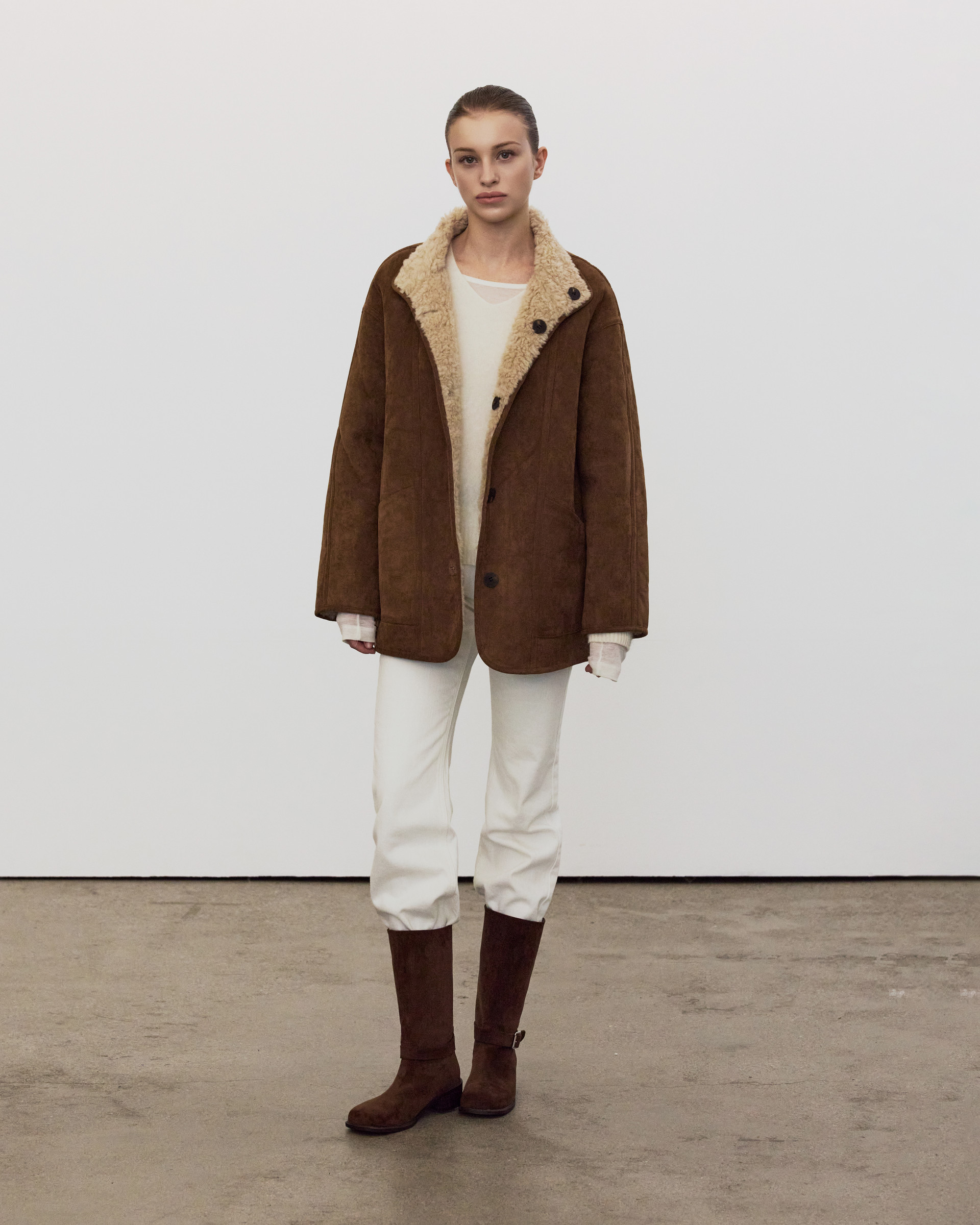 The outerwear line follows with a reversible suede half coat made from soft wool with a distinct, textured grain, down coats and jackets filled with premium duck down for warmth and lightness, and a poodle-fur jacket whose rich texture lends a chic holiday mood.