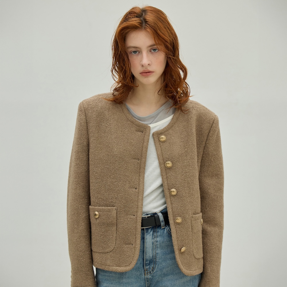The outerwear line follows with a reversible suede half coat made from soft wool with a distinct, textured grain, down coats and jackets filled with premium duck down for warmth and lightness, and a poodle-fur jacket whose rich texture lends a chic holiday mood.